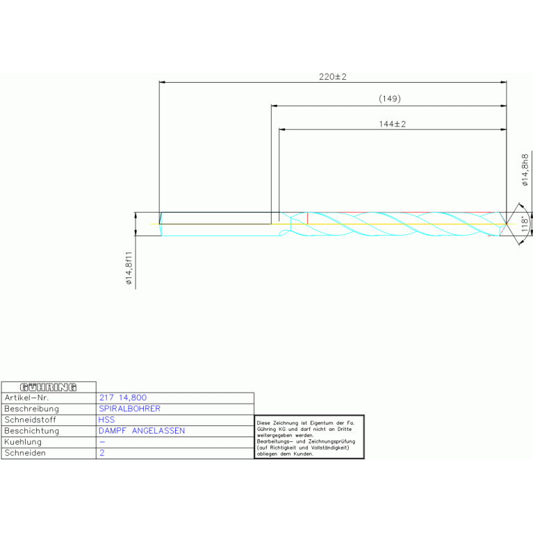 HSS SPIRALBOH, LANG 14,800 DIN 340RN ZYL