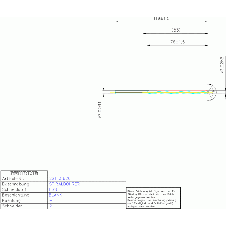 HSS SPIRALBOH, LANG 3,920 DIN 340LH ZYL