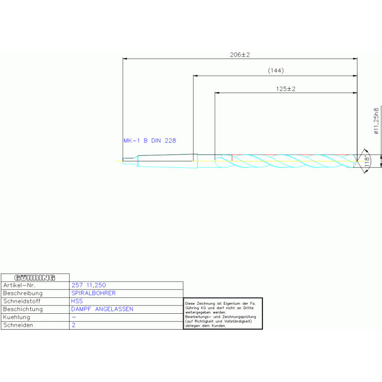 HSS BOHRBUCHSENBOH, 11,250 DIN 341RN MK