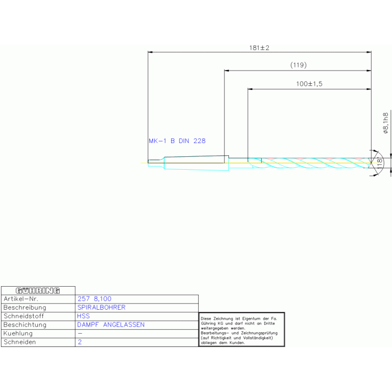 HSS BOHRBUCHSENBOH, 8,100 DIN 341RN MK